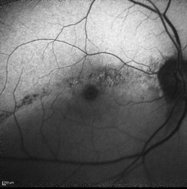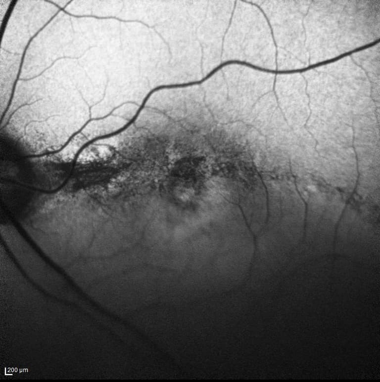 両眼ともに、後部ぶどう腫staphylomaの上縁に一致して乳頭下縁から黄斑を横断するように帯状の網脈絡膜の萎縮巣がみられる。また後部ぶどう腫領域に一致して網膜・脈絡膜が菲薄化しているため、紋理眼底tessel lated fundusがみられる。