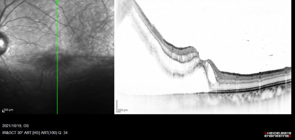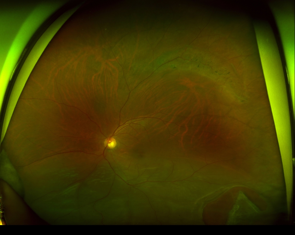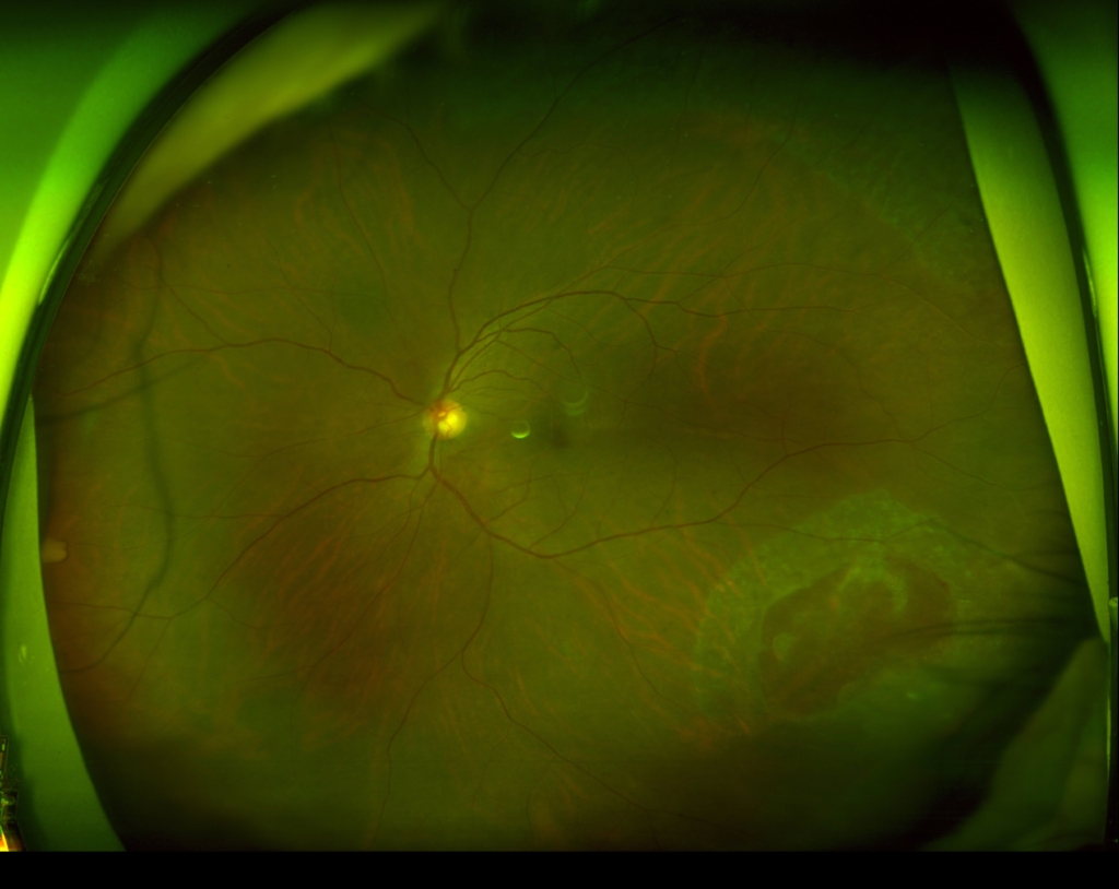 3時から8時に黄斑剥離を伴う胞状網膜剥離があり、4時に弁状裂孔がみられる。