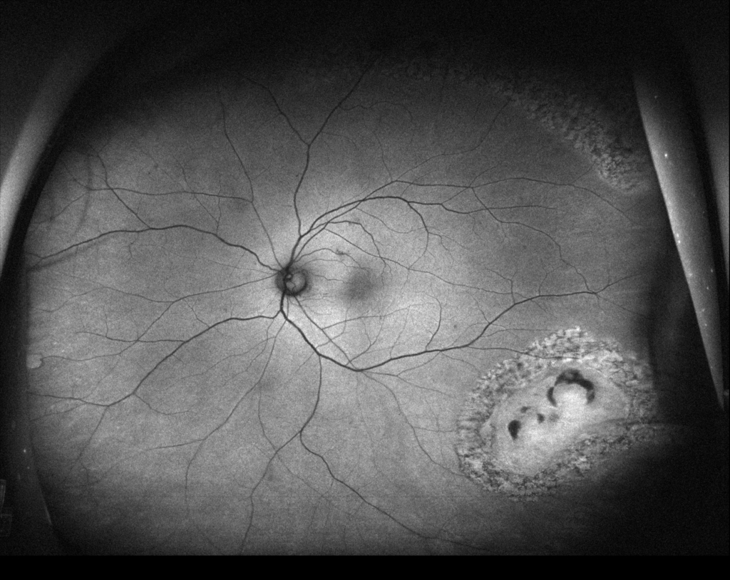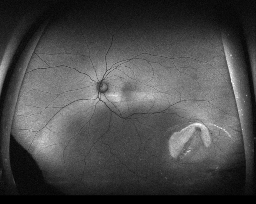 硝子体手術(経毛様体扁平部硝子体切除 Pars Plana Vitrectomy PPV)、眼内レーザー、20%SF6ガス置換)+水晶体再建術を行った。
