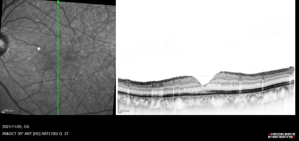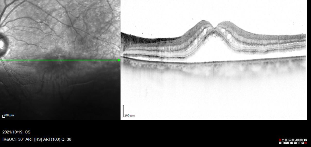 中心窩を含んで網膜剥離があり、外網状層の浮腫と嚢胞様変化がみられる。