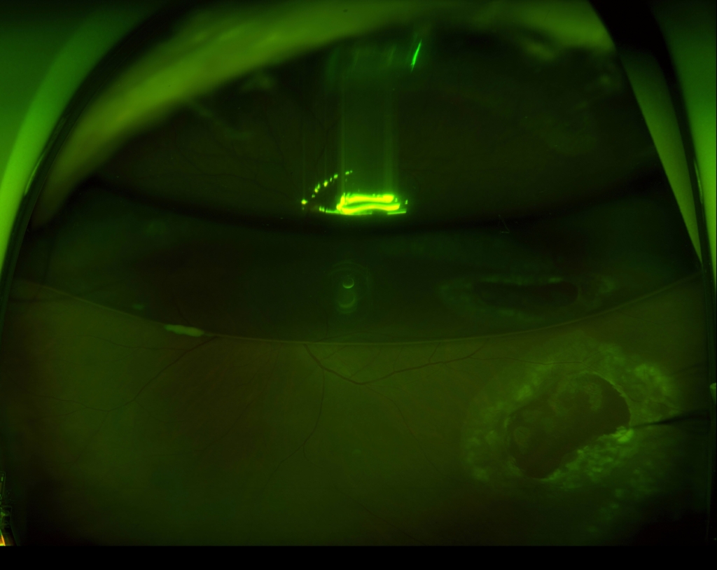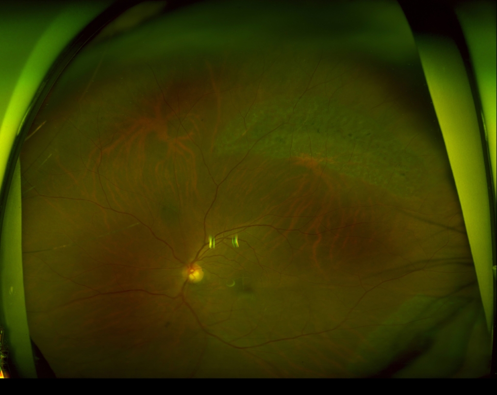 硝子体手術(経毛様体扁平部硝子体切除 Pars Plana Vitrectomy:PPV、眼内レーザー、20%SF6ガス置換)+水晶体再建術を行った。